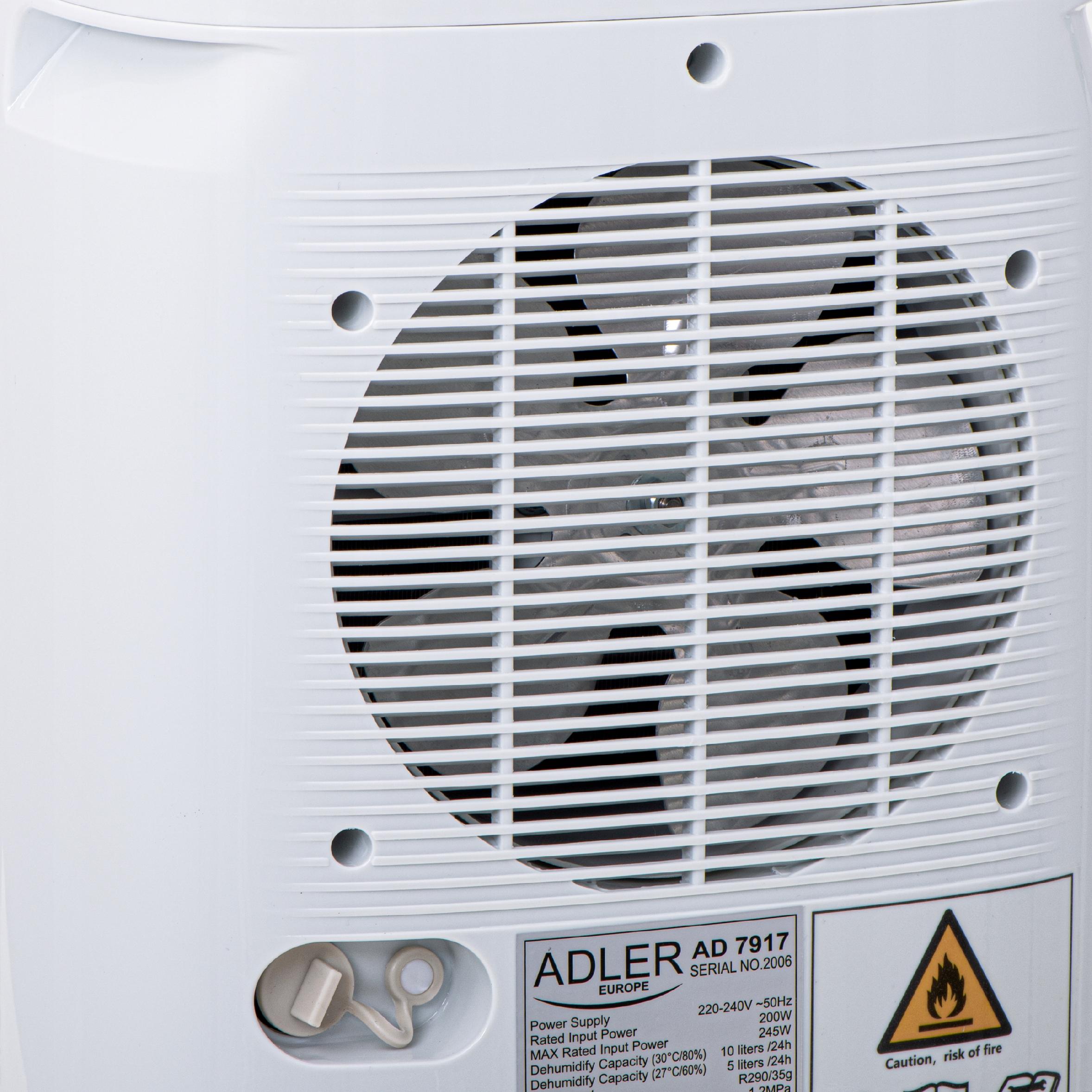 AD 7917 to kompresorowy osuszacz powietrza o wydajności 10 litrów wody na dobę. Urządzenie przeznaczone jest do obniżanie poziomu wilgotności w pomieszczeniach takich jak: łazienki, suszarnie, garderoby. Uławia zachowanie właściwej wilgotności w bibliotekach, muzeach, archiwach, serwerowniach oraz w innych pomieszczeniach, które są narażone na zbyt dużą ilość wilgoci w powietrzu. Sprawdzi się podczas osuszania niższych kondygnacji takich jak piwnice i garaże oraz w przypadku podtopień. Podczas pracy w pralni wydatnie przyśpieszy suszenie ubrań.