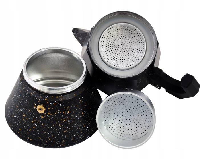 Kawiarka wykonana jest z aluminium i pokryta powłoką a’la marmurek – w białe i złote rozpryśnięcia.
