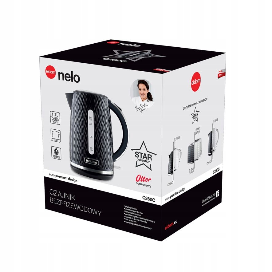 Model C260C NELO został wykonany z wysokiej jakości podzespołów OTTER. Posiada obrotową podstawę z miejscem na nawinięcie nadmiaru przewodu, wskaźnik poziomu wody oraz filtr siatkowy. Można napełniać go bezpośrednio przez wylewkę lub po otwarciu pokrywy (służy do tego wygodny przycisk). Urządzenie jest wyposażone w potrójny system zabezpieczający oraz podświetlany włącznik. Wyłącza się automatycznie po zakończeniu pracy, ale gotowanie w nim wody można też przerwać w każdej chwili. Wystarczy ustawić przełącznik w pozycji „0”.
