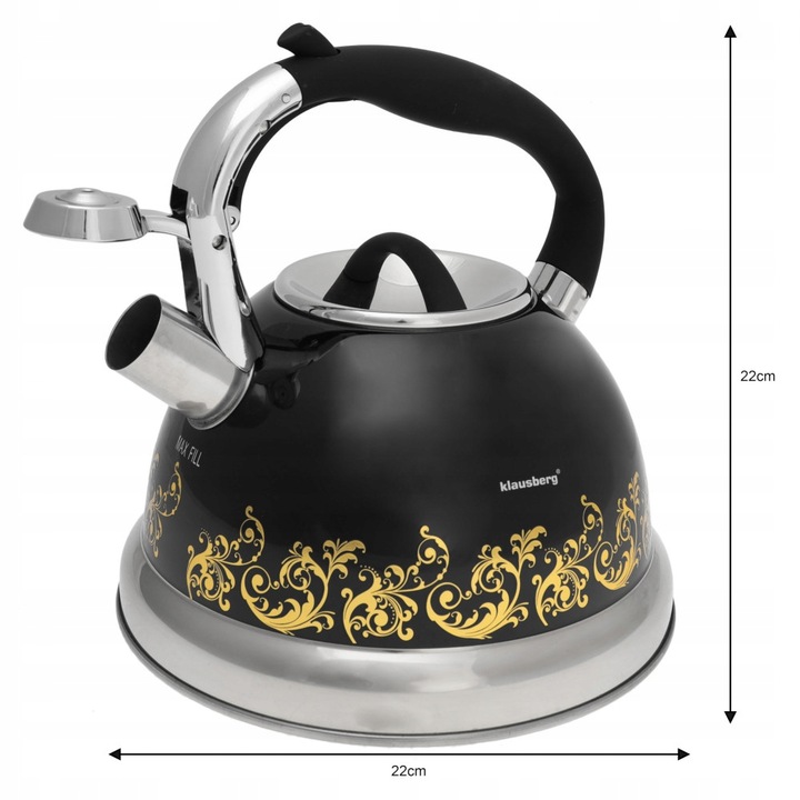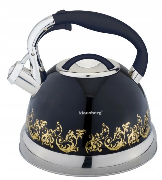 Wysokiej jakości Czajnik lakierowany 2.8L wykonany ze stali nierdzewnej. Zewnętrzna część czajnika pokryta żaroodpornym lakieram ozdobiony złotym wzorem.Gwizdek automatyczny, zamontowany na stałe, umieszczono również wskaźnik maksymalnego napełnianiaUchwyt czajnika oraz uchwyt pokrywki pokryte okładziną silikonową, nie nagrzewające się. Przystosowany do kuchenek gazowych, ceramicznych, węglowych, a także do elektrycznych i indukcyjnych. Nadaje się do mycia w zmywarkach.Wielowarstwowe, wzmocnione aluminium dno, idealnie przewodzące ciepło.Kolor: Czarny
