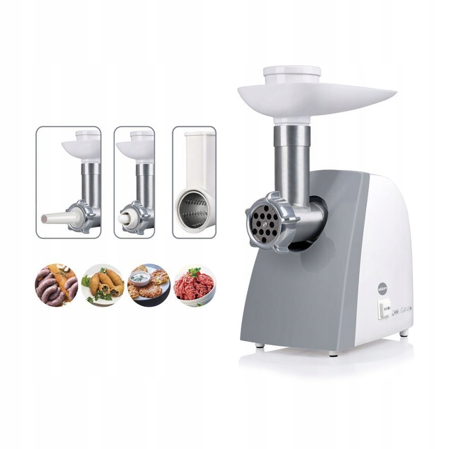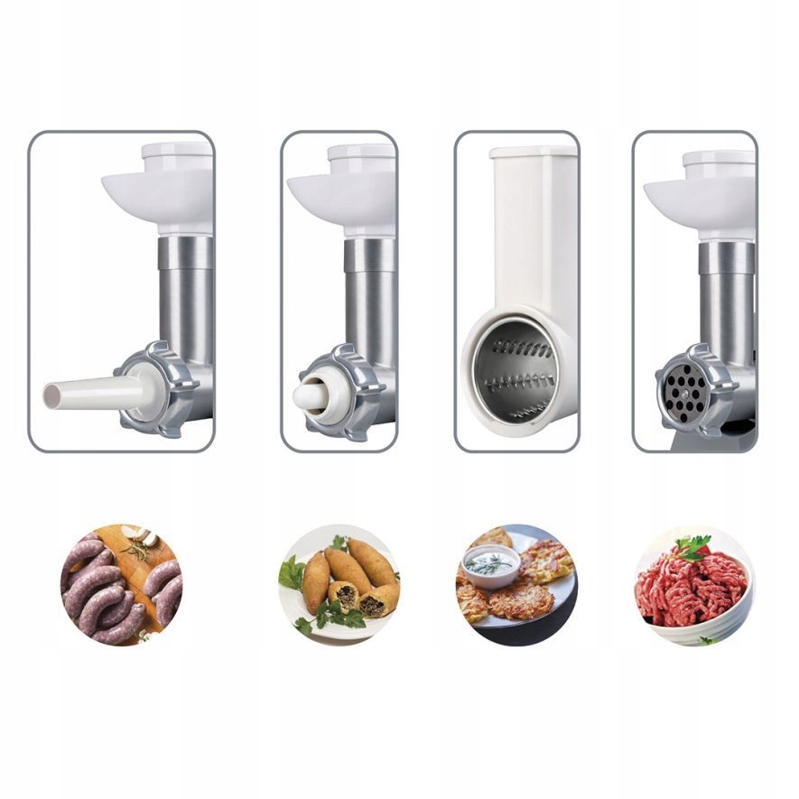 | Załączone wyposażenie | 3 tarki (drobne wiórki, grube wiórki, plastry), zestaw do kebbe, zestaw do kiełbas |