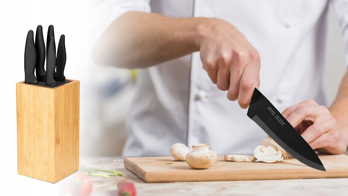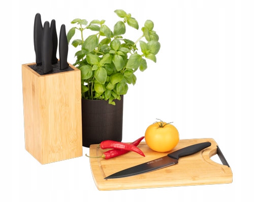 Komplet noży SNS-5 to modny zestaw, idealnie pasujący do każdego wnętrza. Składa się z 6 elementów, który tworzą: praktyczny blok na noże i 5 stalowych noży o różnym przeznaczeniu.